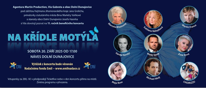 V jihomoravských Dolních Dunajovicích se v sobotu 20. září 2025 od 17.00 hodin uskuteční 11. ročník benefičního koncertu „Na křídle motýla“, a to pod záštitou jihomoravského hejtmana Jana Grolicha, primátorky města Brna Markéty Vaňkové a starosty obce Dolní Dunajovice Josefa Hasníka.